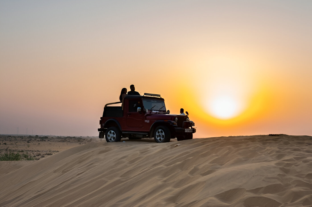 The golden dunes of Jaisalmer come alive with adventure and charm at Hotel Ganga Wild. From the gentle sway of a camel ride to the adrenaline rush of a jeep safari, every experience here is crafted to connect you with the spirit of the desert. Watch the sun dip below the dunes as the sky turns fiery orange, and let the cool desert breeze refresh your soul.